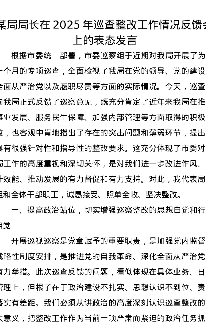 某局局长在2025年巡查整改工作情况反馈会上的表态发言