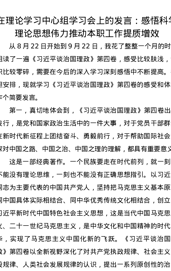 在理论学习中心组学习会上的发言:感悟科学理论思想伟力推动本职工作提质增效