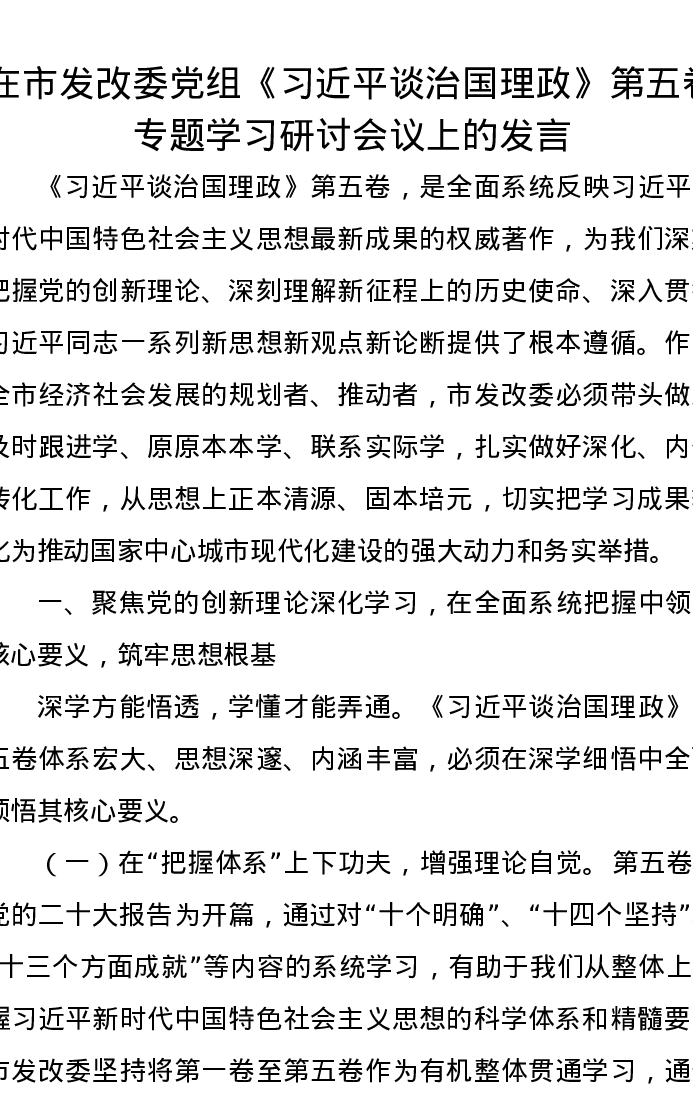 在市发改委党组《习近平谈治国理政》第五卷专题学习研讨会议上的发言