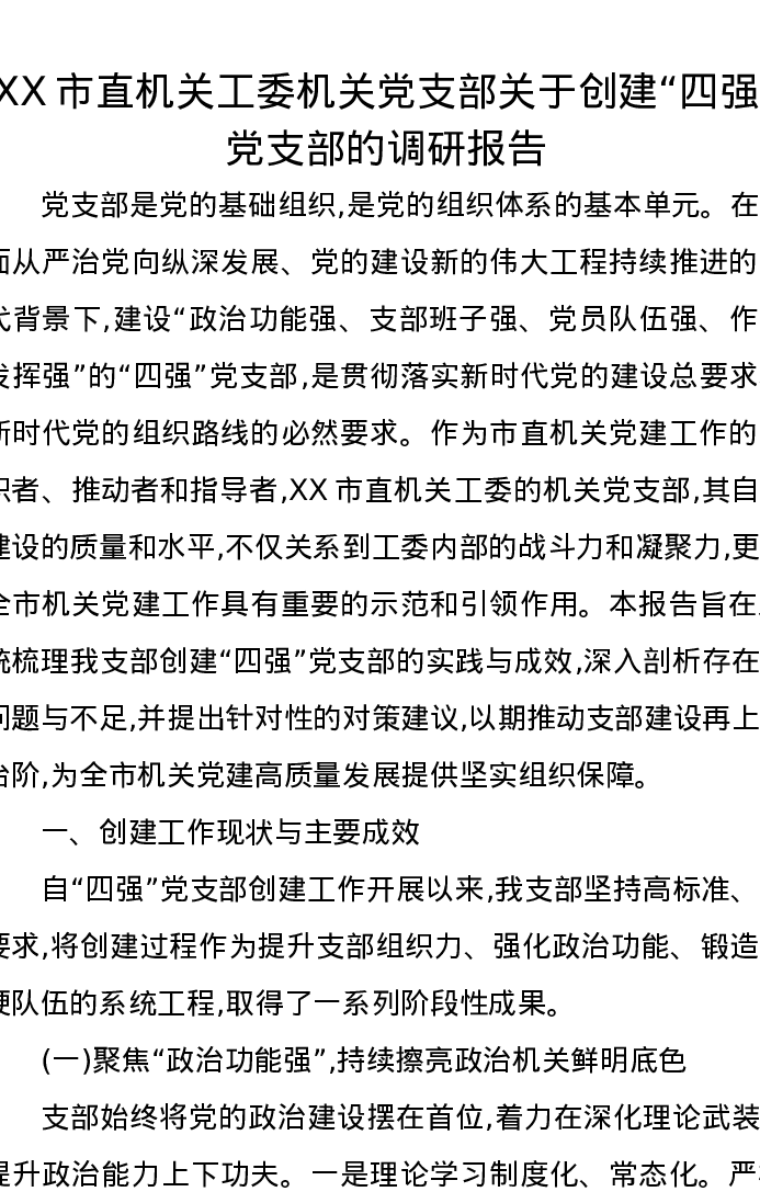 XX市直机关工委机关党支部关于创建“四强”党支部的调研报告