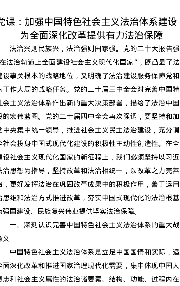 党课讲稿:加强中国特色社会主义法治体系建设,为全面深化改革提供有力法治保障