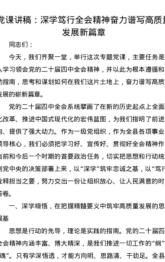 党课讲稿:深学笃行全会精神 奋力谱写高质量发展新篇章