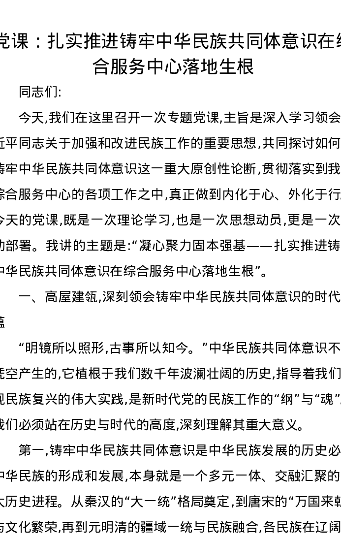 党课讲稿:扎实推进铸牢中华民族共同体意识在综合服务中心落地生根