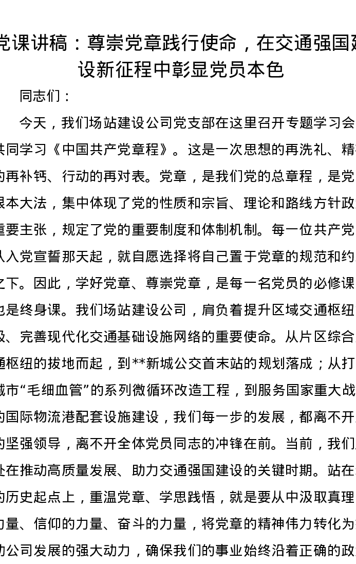 党课讲稿:尊崇党章践行使命,在交通强国建设新征程中彰显党员本色