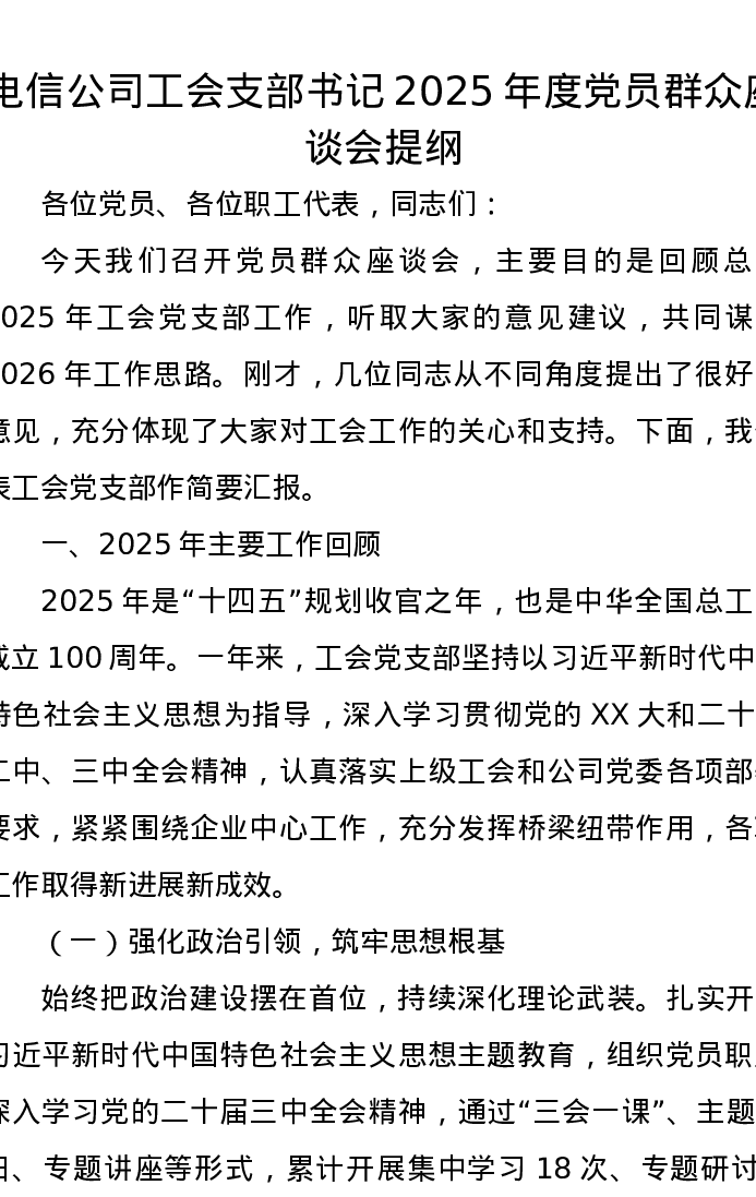 电信公司工会支部书记2025年度党员群众座谈会提纲