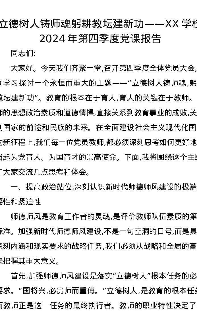 立德树人铸师魂躬耕教坛建新功——XX学校2024年第四季度党课讲稿报告