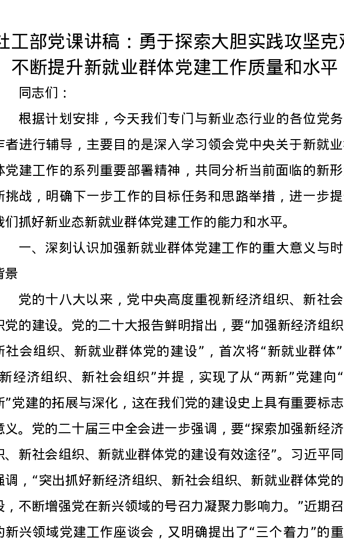 社工部党课讲稿:勇于探索大胆实践攻坚克难,不断提升新就业群体党建工作质量和水平