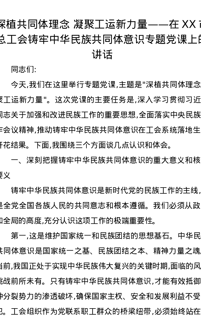 深植共同体理念 凝聚工运新力量——在XX市总工会铸牢中华民族共同体意识专题党课上的讲话
