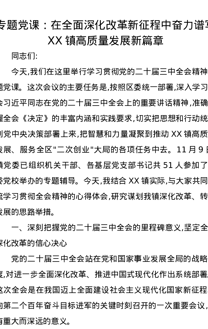专题党课讲稿:在全面深化改革新征程中奋力谱写XX镇高质量发展新篇章