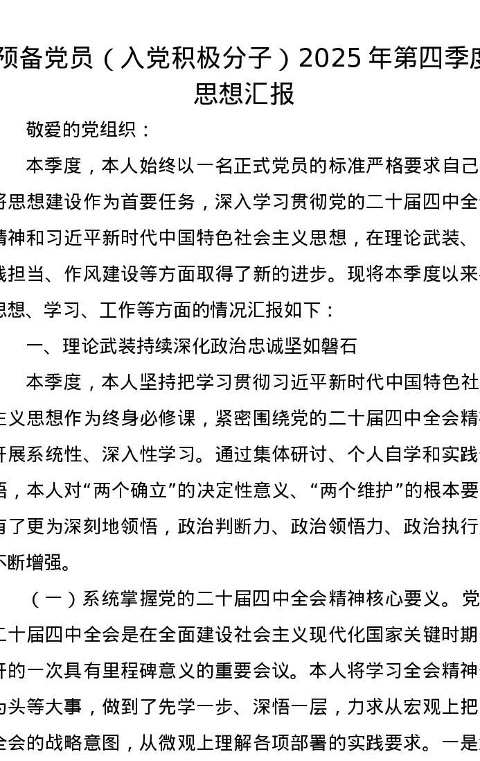 预备党员(入党积极分子)2025年第四季度思想汇报