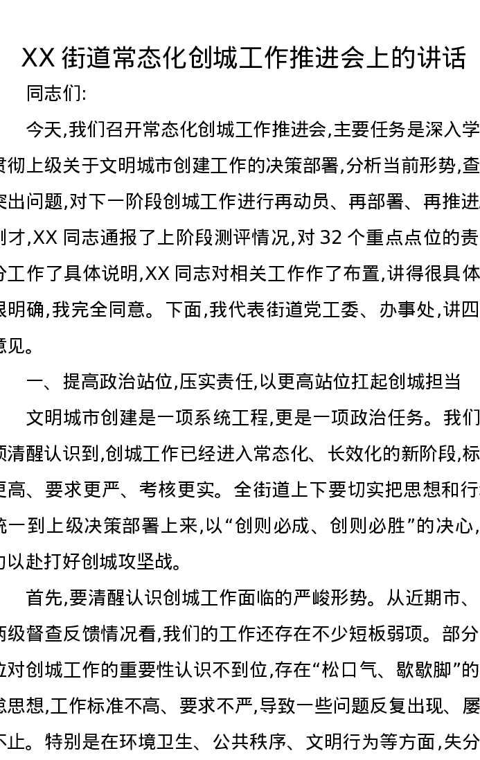 XX街道常态化创城工作推进会上的讲话