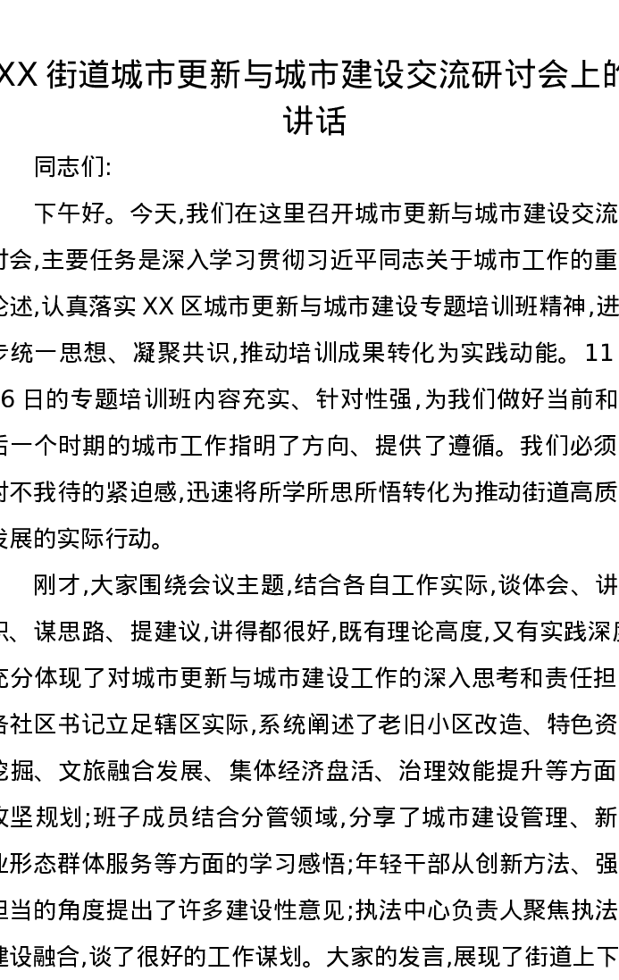 XX街道城市更新与城市建设交流研讨会上的讲话