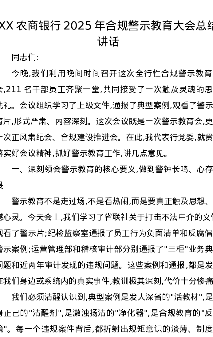 XX农商银行2025年合规警示教育大会总结讲话