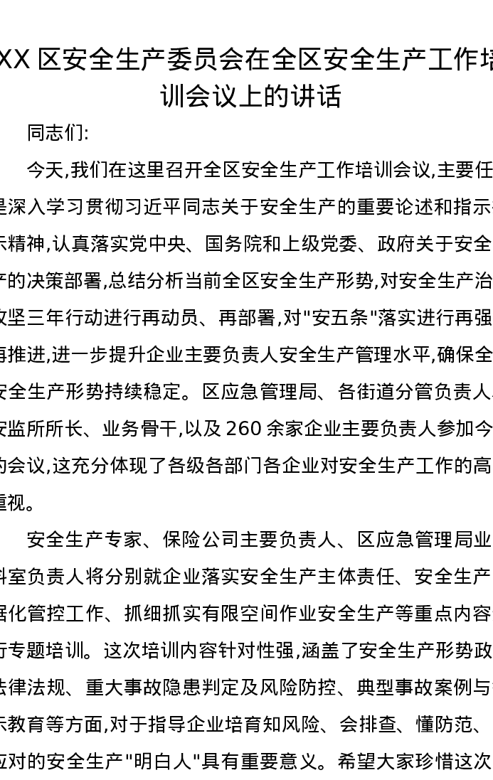 XX区安全生产委员会在全区安全生产工作培训会议上的讲话