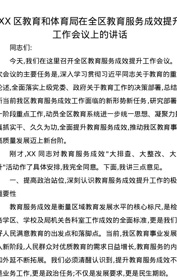 XX区教育和体育局在全区教育服务成效提升工作会议上的讲话