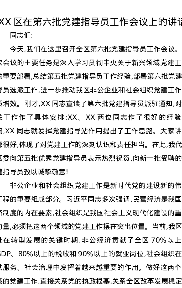 XX区在第六批党建指导员工作会议上的讲话