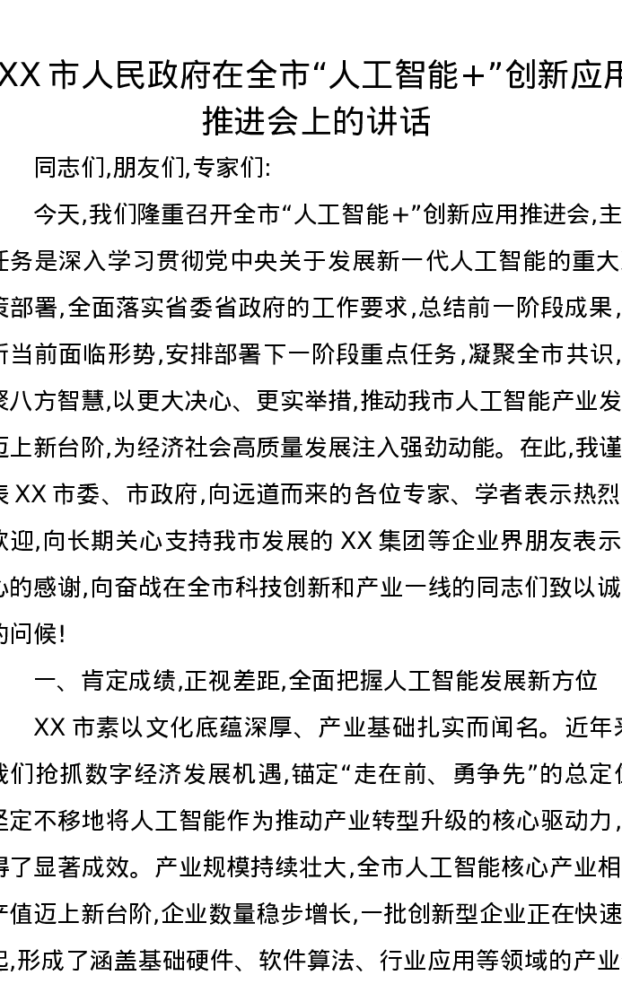 XX市人民政府在全市“人工智能+”创新应用推进会上的讲话