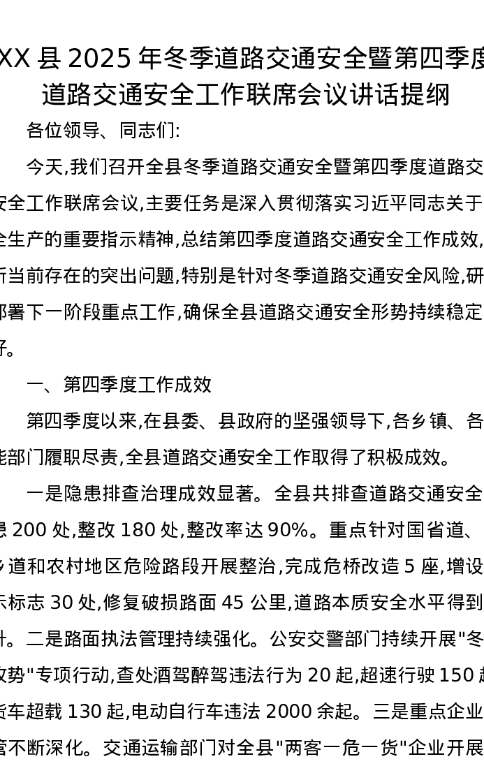 XX县2025年冬季道路交通安全暨第四季度道路交通安全工作联席会议讲话提纲
