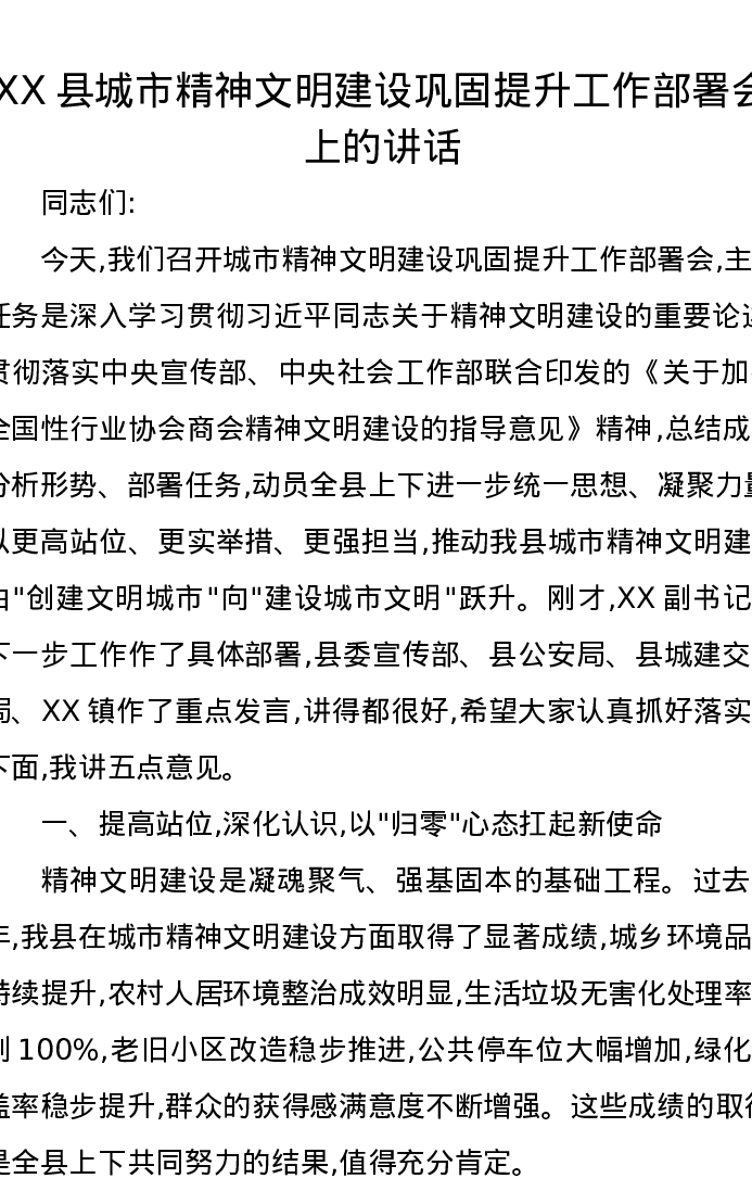 XX县城市精神文明建设巩固提升工作部署会上的讲话