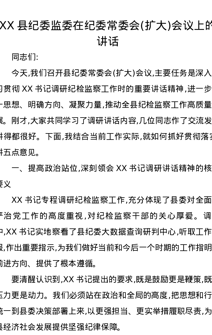XX县纪委监委在纪委常委会(扩大)会议上的讲话