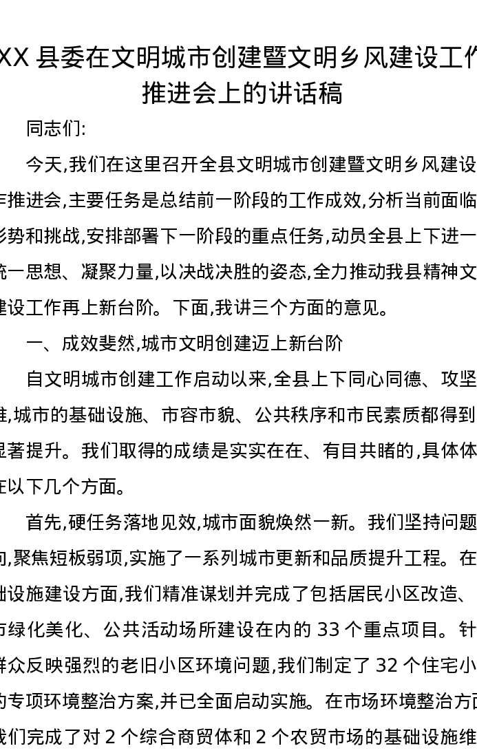 XX县委在文明城市创建暨文明乡风建设工作推进会上的讲话稿