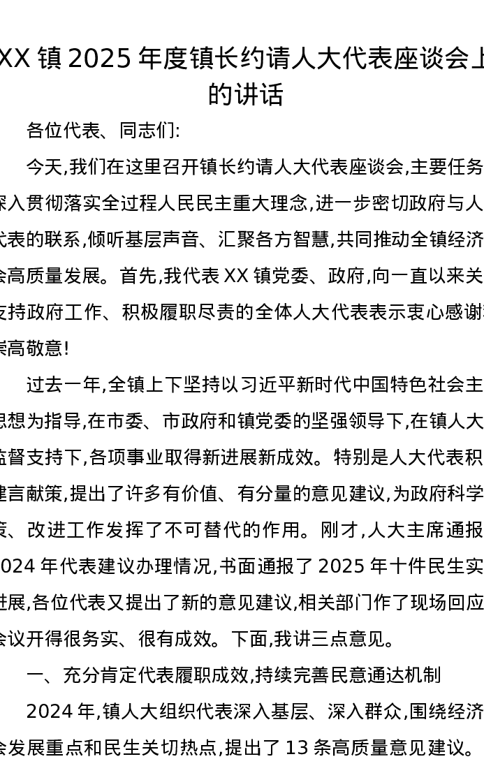 XX镇2025年度镇长约请人大代表座谈会上的讲话