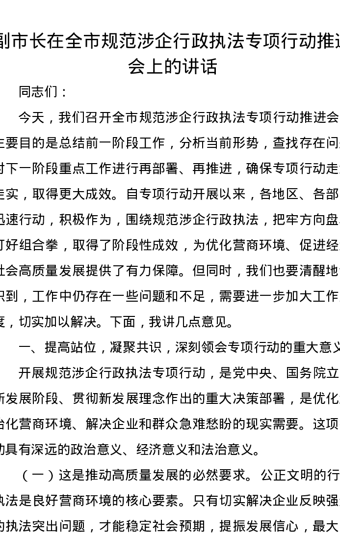 副市长在全市规范涉企行政执法专项行动推进会上的讲话