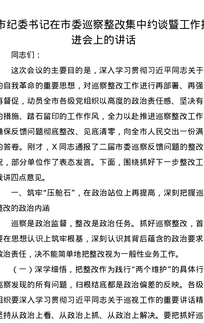 市纪委书记在市委巡察整改集中约谈暨工作推进会上的讲话