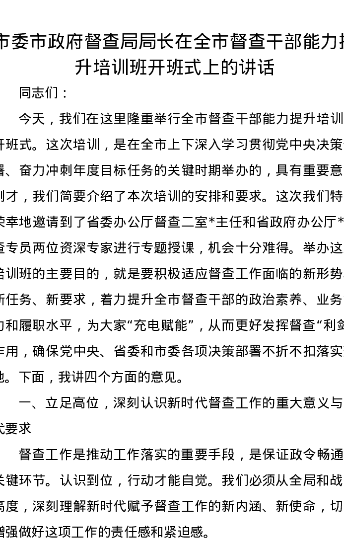 市委市政府督查局局长在全市督查干部能力提升培训班开班式上的讲话