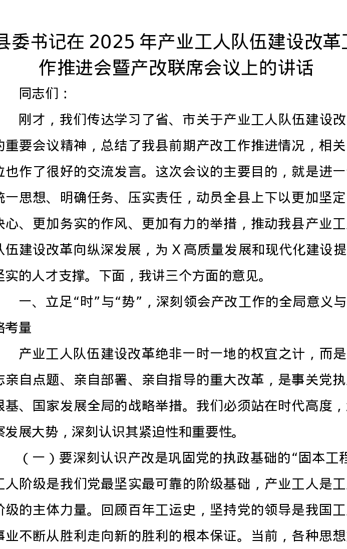 县委书记在2025年产业工人队伍建设改革工作推进会暨产改联席会议上的讲话