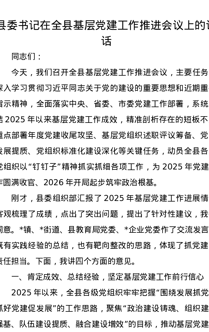 县委书记在全县基层党建工作推进会议上的讲话