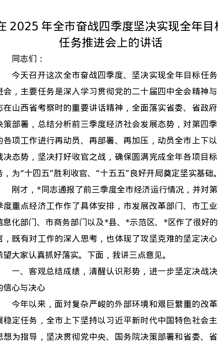 在2025年全市奋战四季度坚决实现全年目标任务推进会上的讲话