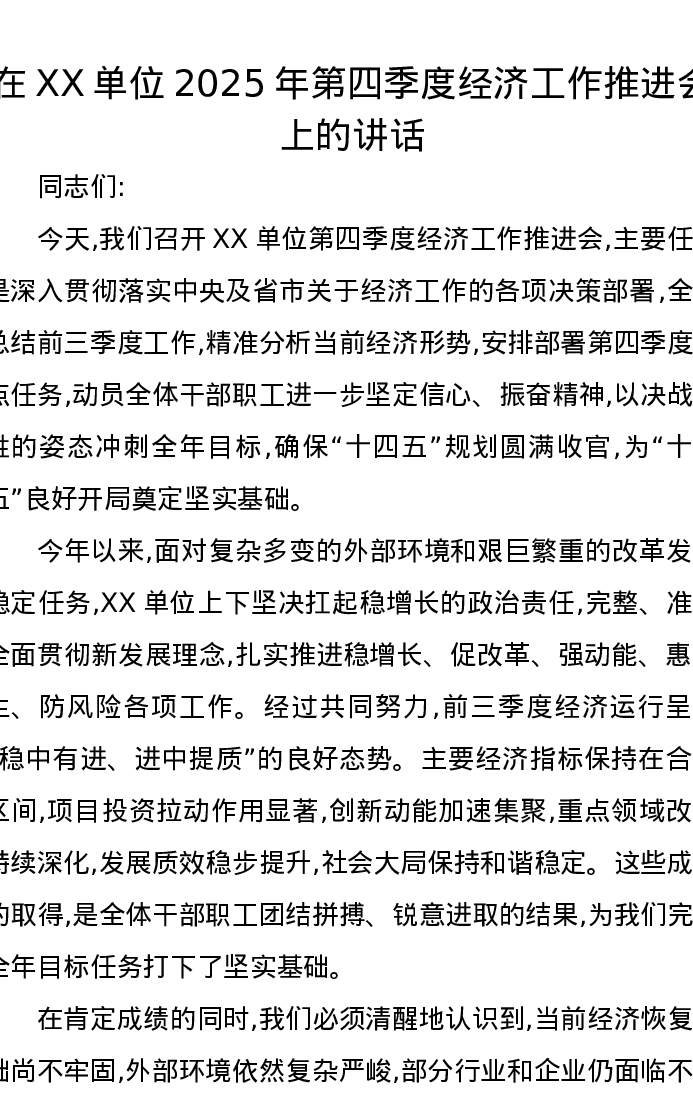 在XX单位2025年第四季度经济工作推进会上的讲话