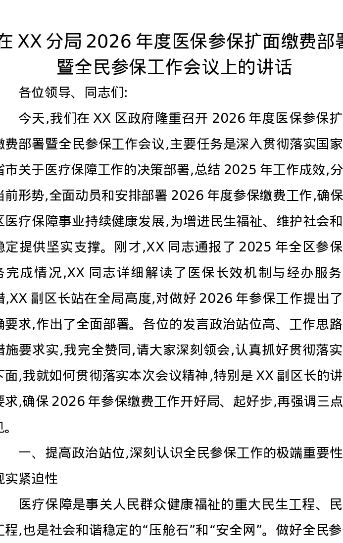 在XX分局2026年度医保参保扩面缴费部署暨全民参保工作会议上的讲话