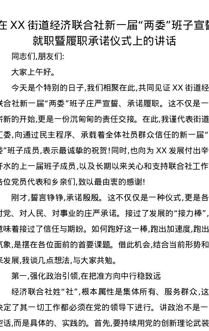 在XX街道经济联合社新一届“两委”班子宣誓就职暨履职承诺仪式上的讲话
