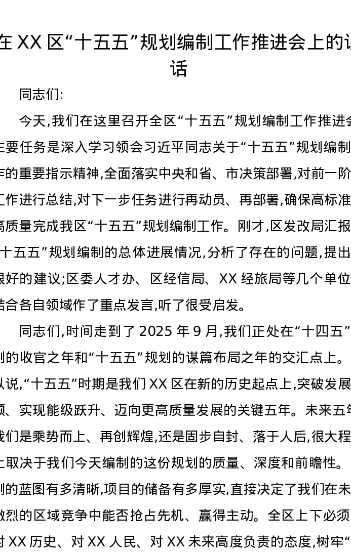 在XX区“十五五”规划编制工作推进会上的讲话