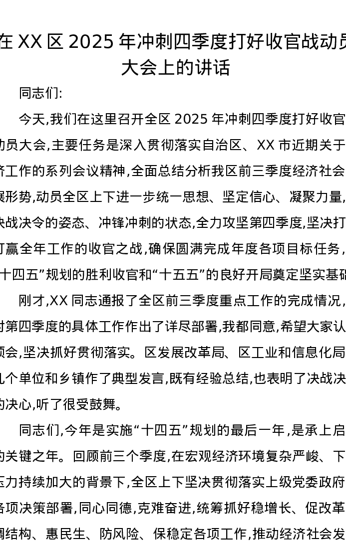 在XX区2025年冲刺四季度打好收官战动员大会上的讲话