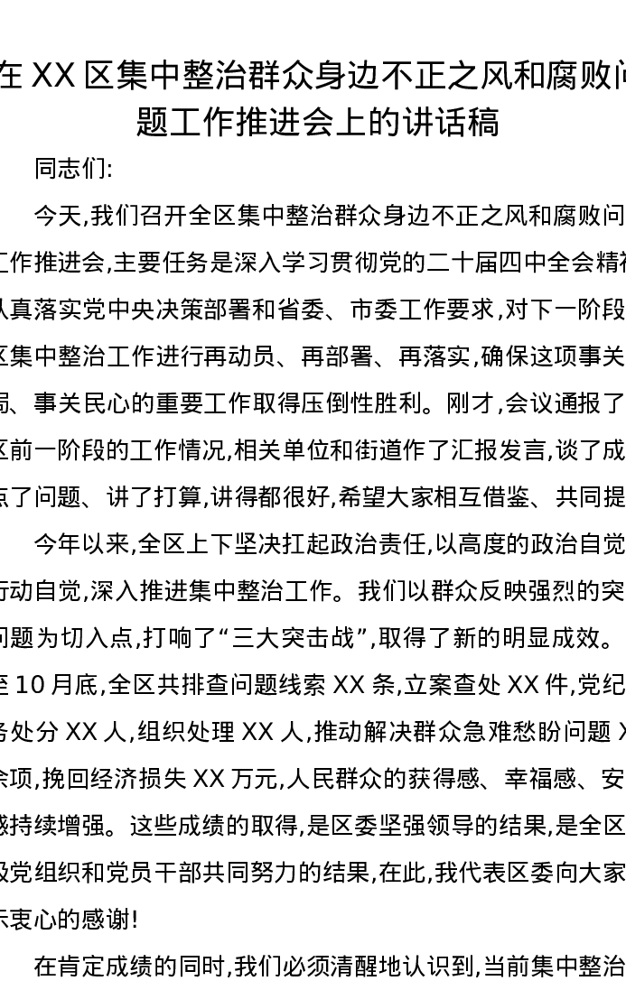在XX区集中整治群众身边不正之风和腐败问题工作推进会上的讲话稿