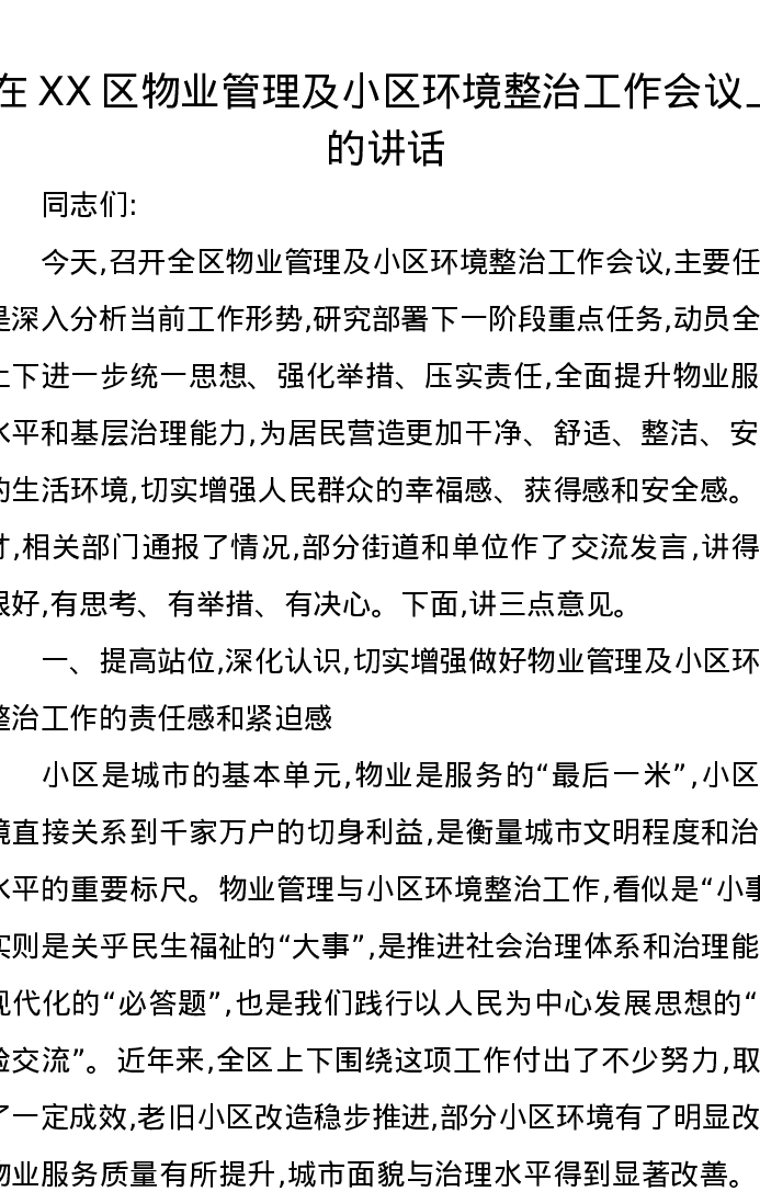 在XX区物业管理及小区环境整治工作会议上的讲话