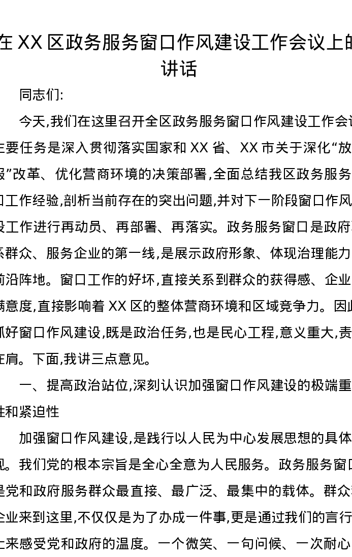 在XX区政务服务窗口作风建设工作会议上的讲话