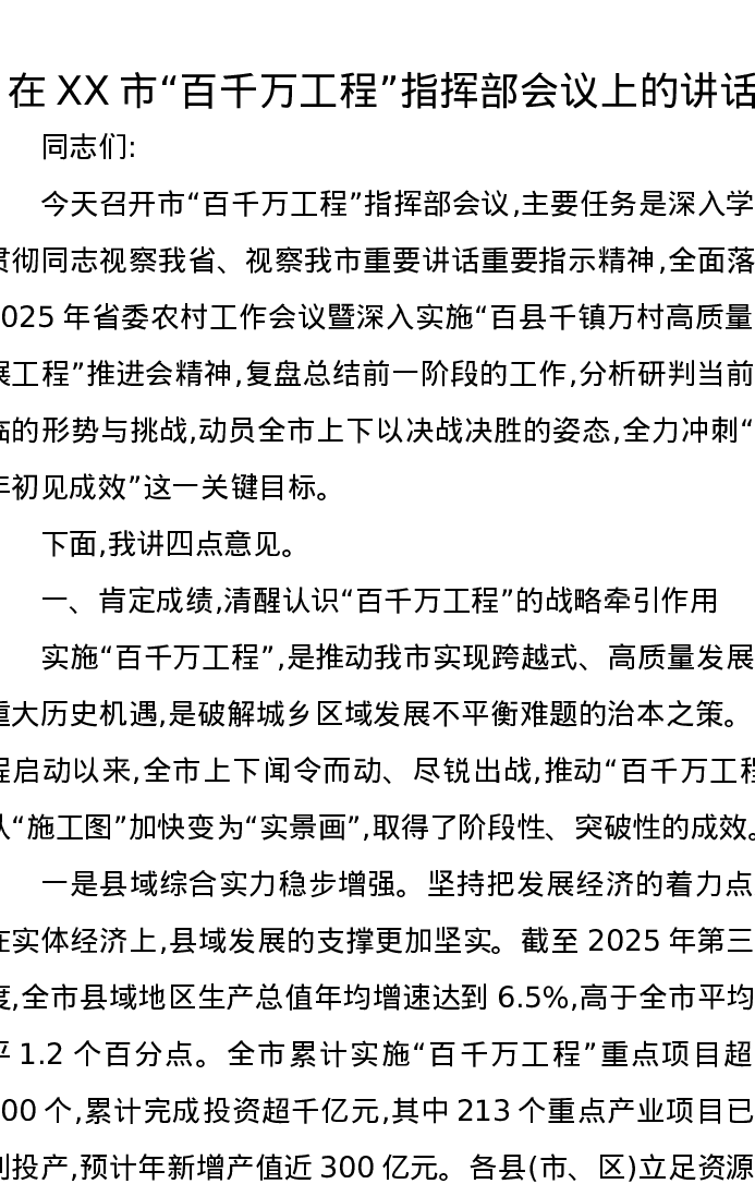在XX市“百千万工程”指挥部会议上的讲话