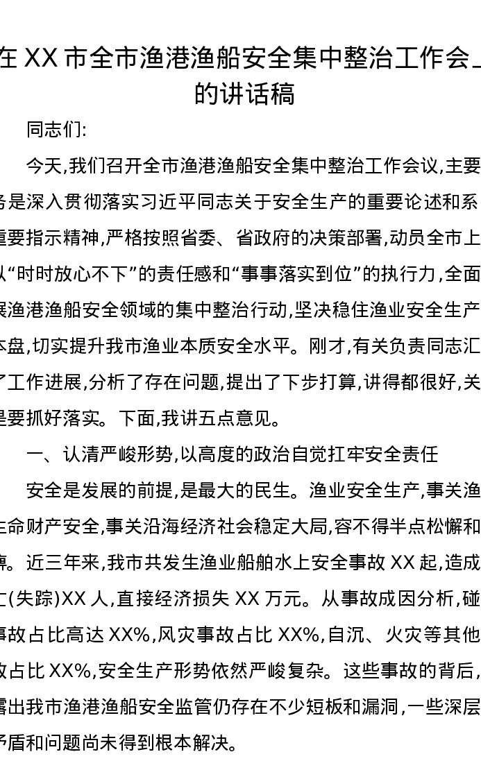 在XX市全市渔港渔船安全集中整治工作会上的讲话稿