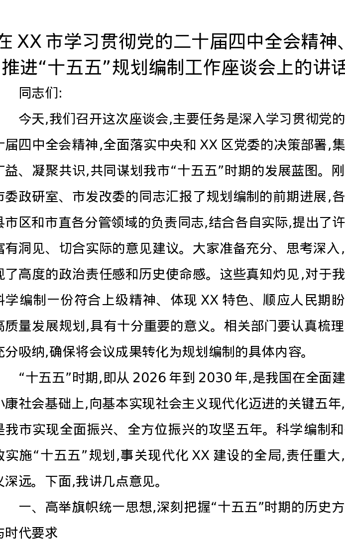在XX市学习贯彻党的二十届四中全会精神、推进“十五五”规划编制工作座谈会上的讲话