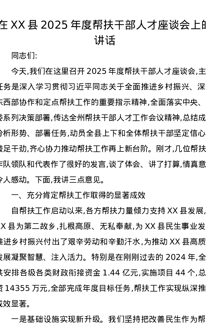 在XX县2025年度帮扶干部人才座谈会上的讲话