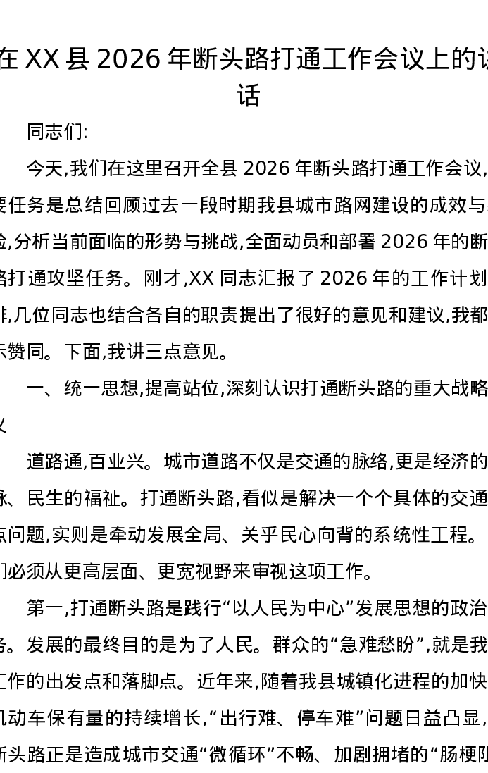 在XX县2026年断头路打通工作会议上的讲话