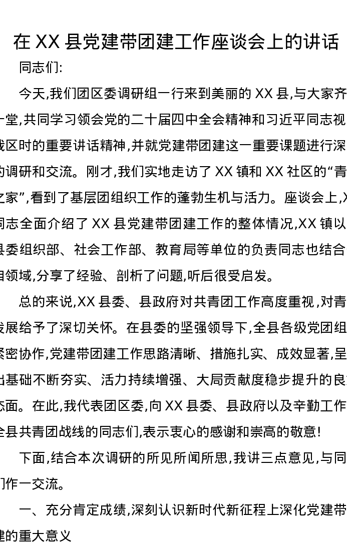 在XX县党建带团建工作座谈会上的讲话