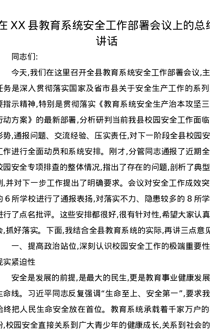 在XX县教育系统安全工作部署会议上的总结讲话