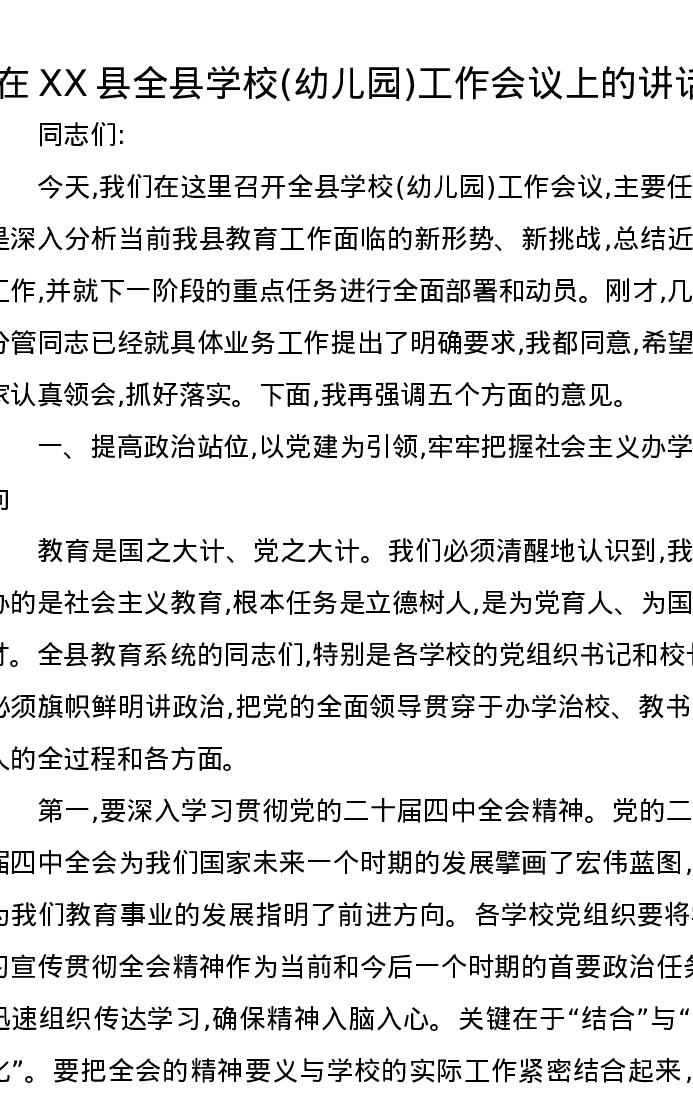 在XX县全县学校(幼儿园)工作会议上的讲话