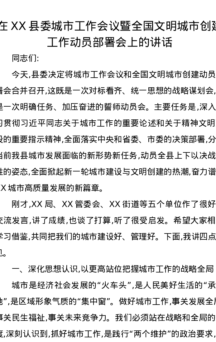 在XX县委城市工作会议暨全国文明城市创建工作动员部署会上的讲话