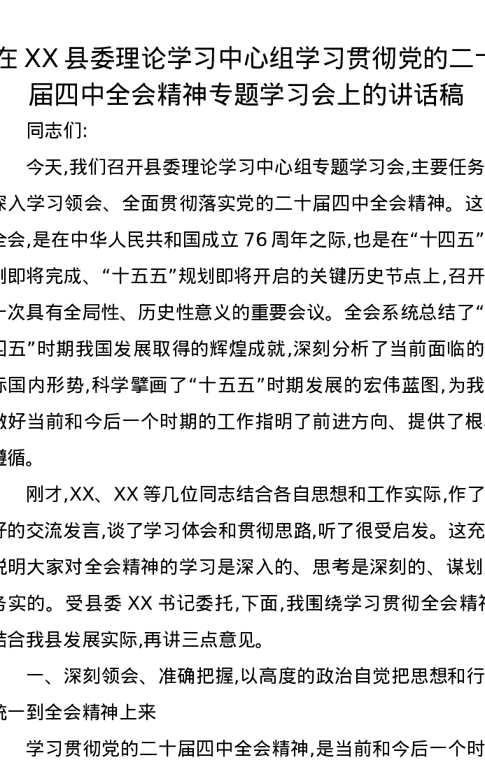 在XX县委理论学习中心组学习贯彻党的二十届四中全会精神专题学习会上的讲话稿